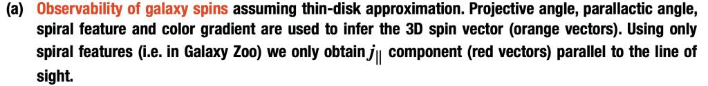 如何观测星系角动量 —— 图(a):通过观测盘星系(薄盘近似)在天空的投影椭圆可以推测出星系旋转的角动量方向的四种可能性。为消除这四种角动量方向的简并,我们还需要观测旋涡星系的旋涡“缠绕”方向,分别为“S”型或“Z”型,以及星系盘的颜色梯度,如图(a)所示。绝大多数星系向旋臂“凸”的方向旋转,且在远离观测者的方向呈现更多的尘埃消光(颜色偏红)。另外,谱线的Doppler效应也可以测量星系的旋转方向。图(a)橙色箭头表示了星系的角动量方向,红色/绿色箭头表示沿视线平行/垂直方向的角动量方向。