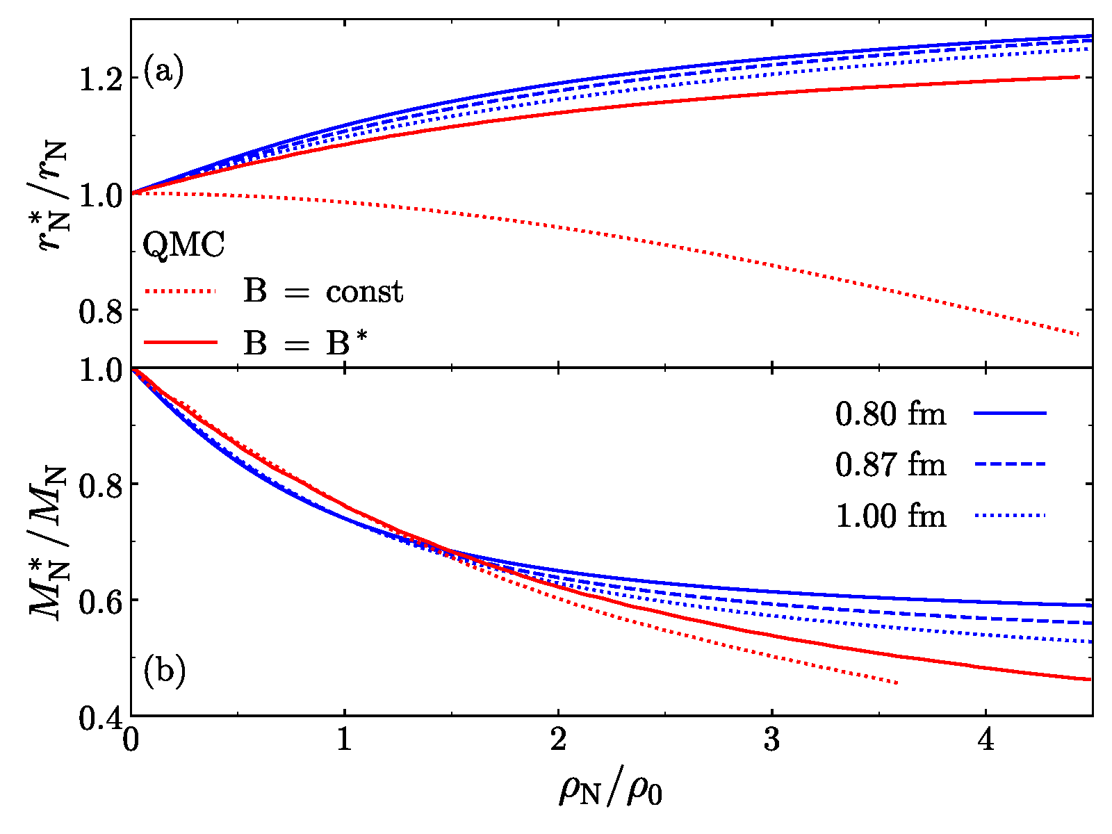 在该工作中,从夸克层次出发的物理模型——夸克平均场模型(Quark mean field model)被采用。通过固定核物质的饱和性质,该工作研究了不同核子半径(0.80, 0.87, 1.00 fm)对中子星半径(R)的影响。最终的结果显示,核子半径对中子星半径的影响非常小,而相比较下核物质的对称能(J)和对称能斜率(L)的影响反而更加重要。对称能是系统中由于质子和中子数不相同产生的附加能量。之前工作关于“核子半径显著影响中子星半径”的结论显然是由不同对称能和对称能斜率导致的。