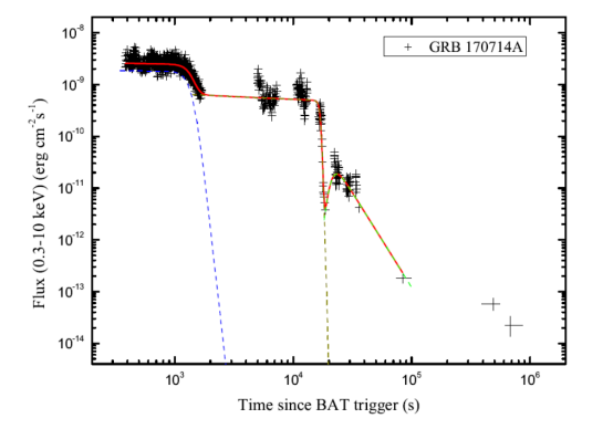 通过对伽玛射线暴(GRB)GRB 170714A的X射线光变(如图所示)的细致研究,发现其不同于其他GRB,可能拥有两个平台和一个鼓包结构。运用磁星模型难于解释两个平台,所以我们提出了夸克星相变、夸克星spin-down以及夸克星塌缩为黑洞后的回落吸积来解释上述三个阶段。而最初的双中子星并合成夸克星,夸克星的冷却过程可能对应于平滑的瞬时辐射光变阶段。从数值估计上来看,模型与观测吻合的非常好。