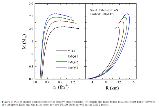 我们对比了致密星的两种物态方程(EOS)模型,发现双星并合更可能产生的不是SM中子星,而是SM夸克星(如卡通图示);而且SGRB平台相的三个观测量可能只与EOS模型所预测的星体最大静止引力质量(Mtov)相关。所以可以基于双中子星系统质量的观测限制来重新定义SM夸克星的EOS。我们采用MIT模型来构建新EOS(PMQS1,PMQS2,PMQS3),计算了这些SM夸克星的快速转动性质,并进一步拟合得到了这些计算结果的解析公式,以方便应用(如下图所示)。
