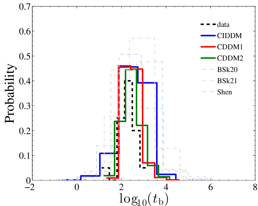 强磁场超重致密星被认为是一种可能的中心引擎模型。我们严格求解广义相对论下快速转动致密星结构方程,基于SWIFT卫星2005/01至2015/10期间21个具有平台的短暴样本,计入引力波辐射的能耗,通过模拟全部三个观测量(爆发时标,光度,电磁辐射能),得到了对星体椭率、初始自转、表面磁场的自洽描述(如表格1)。特别地,我们采用了最新发展的中子星统一物态方程,消除了以前模型计算中“拼接”带来的不确定,使物理结论更加明确;而且通过与夸克星计算结果的对比发现(如图2):这种X波段平台,很可能是双星并合产生一个夸克星的信号,双星并合有可能是强子-夸克退禁闭相变发生的宇宙环境之一。该工作发表在国际权威物理期刊美国物理学会Physical Review D上,详见《Internal x-ray plateau in short GRBs: Signature of supramassive fast-rotating quark stars?》,Phys. Rev. D 94,083010 (2016)。