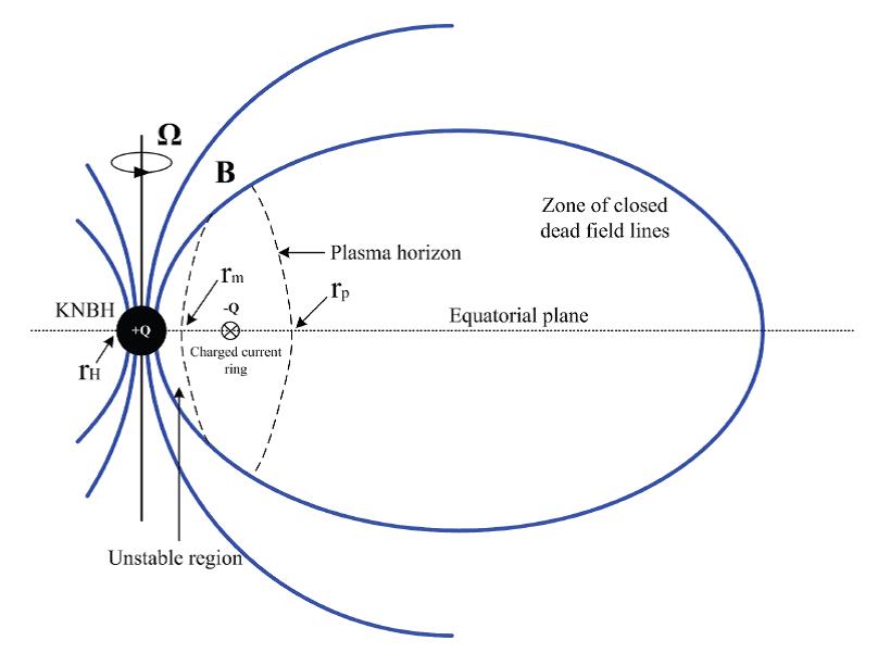 快速射电暴(FRB)是在毫秒级射电波段的剧烈爆发现象,可能是发生在宇宙学距离上的事件。在理论模型的角度,一般认为FRB与致密天体(如白矮星、中子星)或致密双星相关。我们提出Kerr-Newman黑洞(KNBH)的磁层塌缩可以解释GW 150914的疑似成协短暴和FRB 150418及其余辉。图1和2分别展示了KNBH的初始状态和磁层塌缩引发FRB及其余辉的过程。一旦rm和rp所夹区域内的电荷进入rm内的区域,就会迅速落入KNBH,中和黑洞电荷,通过估计电荷落入黑洞的时标,证实此过程可以引发FRB。电荷被中和后,磁场耗散引发伽玛或射电辐射,可以解释GW 150914疑似成协短暴,亦可解释FRB 150418的余辉。