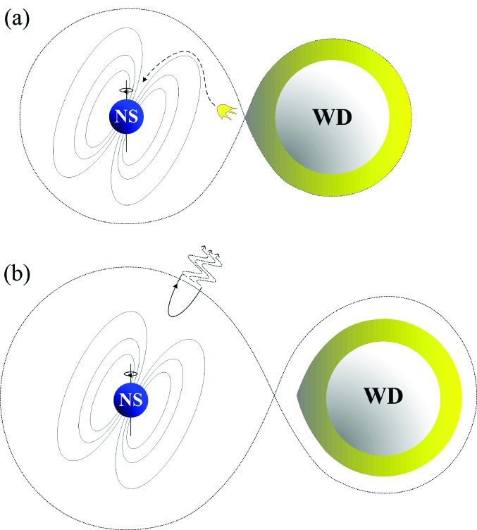 图:(a)白矮星的大气物质通过内拉格朗日点被中子星吸积;(b)被吸积的物质在中子星表面附近发生磁重联,触发快速射电暴。同时,由于角动量守恒,白矮星被弹开。随后,由于引力波辐射两个致密天体将不断靠近。当白矮星再次充满洛希瓣时,有可能再一次触发快速射电暴。