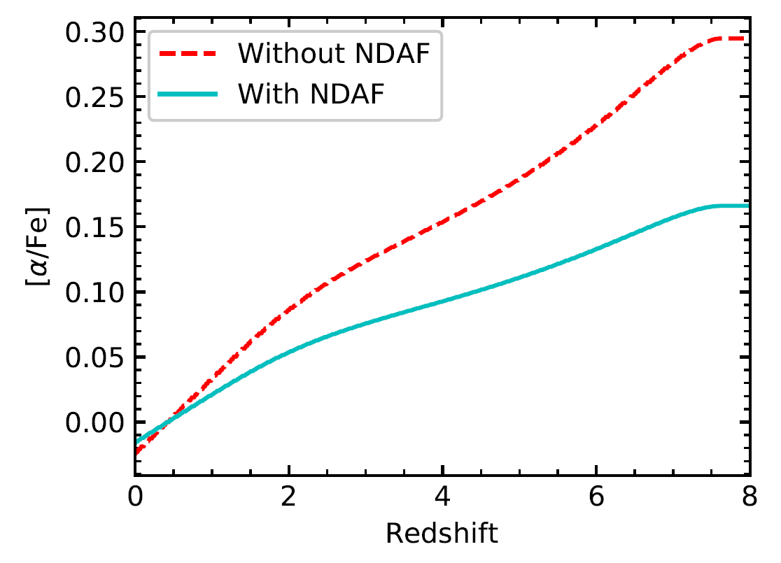 56Ni不稳定,会衰变为56Fe。我们可以将NDAF的贡献考虑进来,结合CCSN来分析在星系及宇宙大尺度上56Fe及其他元素的化学演化问题。结果表明,加入NDAF贡献后,相比原有56Fe对初始气体质量的占比最多提升1.95倍。这为理解星系(或活动星系核)化学演化和太阳附近高金属丰度等问题提供了可能途径;如再将Ia型超新星的贡献考虑进来,则NDAF外流对高红移的贡献被进一步凸显出来,[α/Fe]在红移8处可以提升1倍左右(如图2所示),这可以用于理解高红移星系的高金属丰度观测。