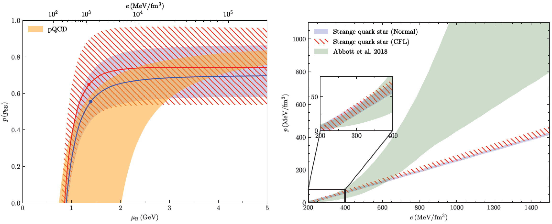 图. 致密QCD物质的状态方程(EOS);左:压强-重子化学势关系。pQCD是微扰 QCD的结果,仅适用于极高密度(重子化学势高于~2.6GeV),而双星并合的引力波数据可以在与致密星特性相关的非微扰领域有效地约束 EOS;右:压强-密度关系。Abbott et al. 2018是LIGO/Virgo合作组基于中子星假设的分析结果,可以看出:在低密度下,夸克星EOS比中子星EOS更早变硬(表明夸克星的尖锐表面密度较低),而在高密度下,夸克星EOS比中子星EOS要软(表明夸克星最大质量低于中子星最大质量)。