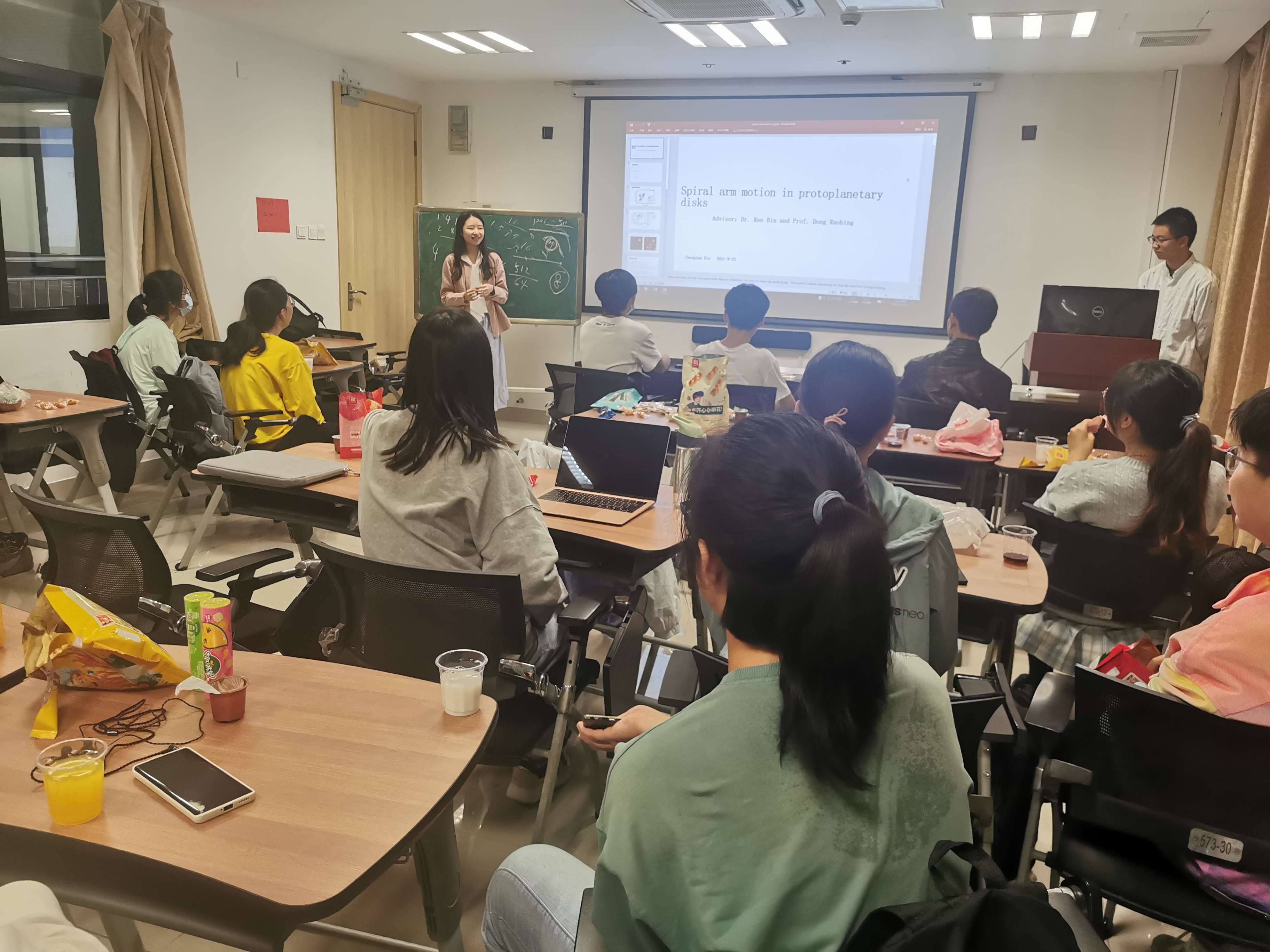 本次活动除了18-20级拔尖班同学与拔尖班班主任孙谋远老师参加外,还吸引了许多对天文充满兴趣的21级本科生参与。活动中,谢承炎同学从以往对原行星盘系统悬臂形成的模拟观测工作讲到他所做的具体研究工作,激发了许多同学的科研热情。同学们踊跃发言提问,活动气氛轻松又不失严谨。