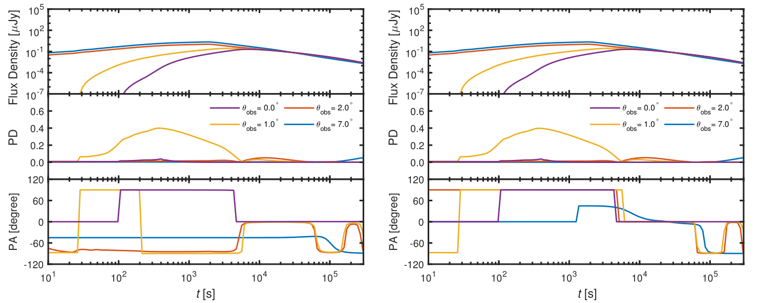 图1 有序磁场主导下余辉光变、偏振度和偏振角的演化;左、右子图分别考虑了反向激波中存在条形和环形磁场结构。
