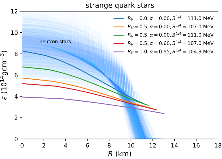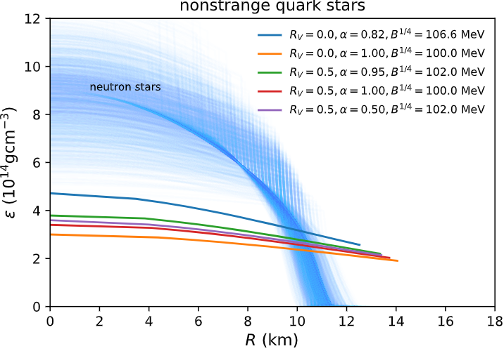 我们的结果表明,ud夸克星和uds夸克星都可与目前的质量、半径和潮汐形变限制相协调;ud夸克星允许的最大质量大于uds夸克星,最高可达2.7倍太阳质量,所以具有更高的不可压缩性(incompressibility)。进一步与中子星中的密度和声速性质作比较,我们发现:ud和uds夸克星中的声速都是单调上升的,并在高密超过(微扰QCD)共形极限(conformal limit),这与基于简单袋模型中在假设夸克近自由的情况下得到的近共形极限的常声速结果有本质不同;而中子星中的声速可远超共形极限的特征行为可自然基于其和夸克星在结构上的巨大差异来理解。比如,从两类星体的密度分布可以看出:ud和uds夸克星都具有接近核密度的巨大表面密度,核心密度仅比表面高几倍,而中子星从表面和核心有14个量级的密度变化。