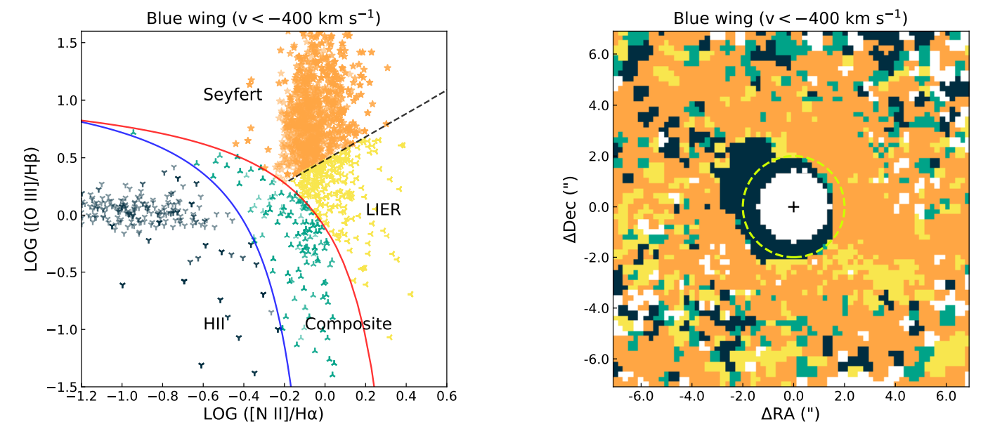图1:左:BPT诊断图。右:对应的BPT空间分布图。这里取的发射线流量是速度 v< -400 km/s的部分,这部分的辐射应主要来自于外流成分。黄色虚线圈标记的是星爆环的位置,黑色十字是星系中心。