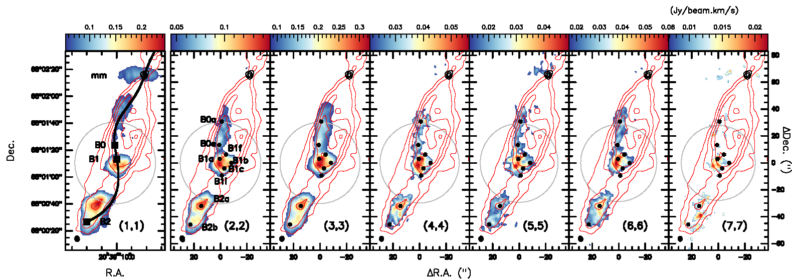 图1:L1157外流蓝移端连续激波区氨分子 NH3(1,1)–(7,7) 转动谱线从−25 到 +25 km s−1强度积分图