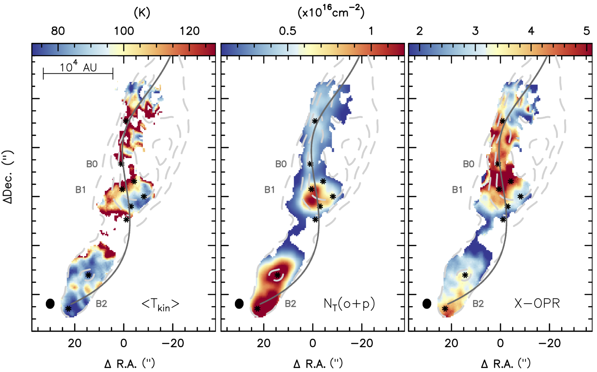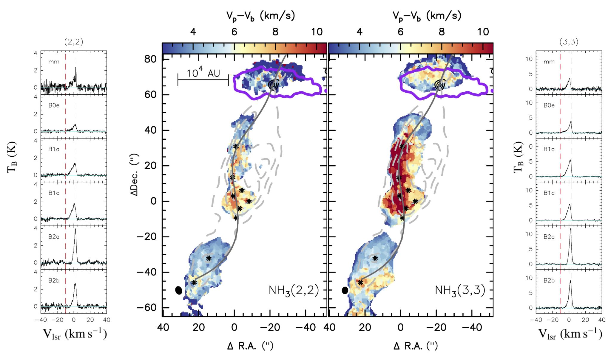 利用 The Karl G. Jansky Very Large Array,冯思轶团队对L1157 的外流蓝移端连续激波区的氨分子 (1,1)–(7,7) 转动谱线做了高灵敏度成图观测。得益于观测的的高速度分辨率,这些分子谱线不仅示踪了原恒星盘平坦包层的宁静冷气体,更揭示了高速外向流打到周围介质时产生的复杂的物理与化学过程。特别地,该观测表明,氨分子的ortho与para两态的丰度比沿着喷流前进的路径(激波速达10km/s)有约2.5倍增丰。该增丰与氨分子的柱密度分布呈强空间相关。更重要的是,该最新观测给出了此区域迄今最高精度的温度密度图,并清晰地显示,在1500au的高空间分辨率下,激波从温暖的B0东部腔壁 (> 120 K) 在前进过程中冷却到B1以及1000年前打出的B2 (< 80 K)区域。