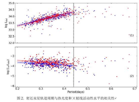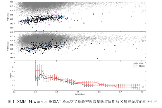 密近双星,或称EW型双星,是一类两颗子星均充满洛希瓣结构且存在物质交换的双星系统;其轨道周期较短(一般小于1天)。对于该类双星,大多数的现有研究都集中于光学波段。X射线辐射亦是该类双星的一种极其重要的特征,能够体现双星系统中的恒星活动性,为本研究的重点所在。利用All-Sky Automated Survey for Supernovae Variable Stars (ASAS-SN) 项目的变星数据库和X射线卫星XMM-Newton与ROSAT所释放的X射线源星表,厦门大学天文学系武剑锋教授团队的博士生刘军辉与合作者编制了迄今为止最大的具有X射线辐射的密近双星(EWX)样本库,对1 kpc范围内密近双星的X射线辐射特性进行了系统性的研究。