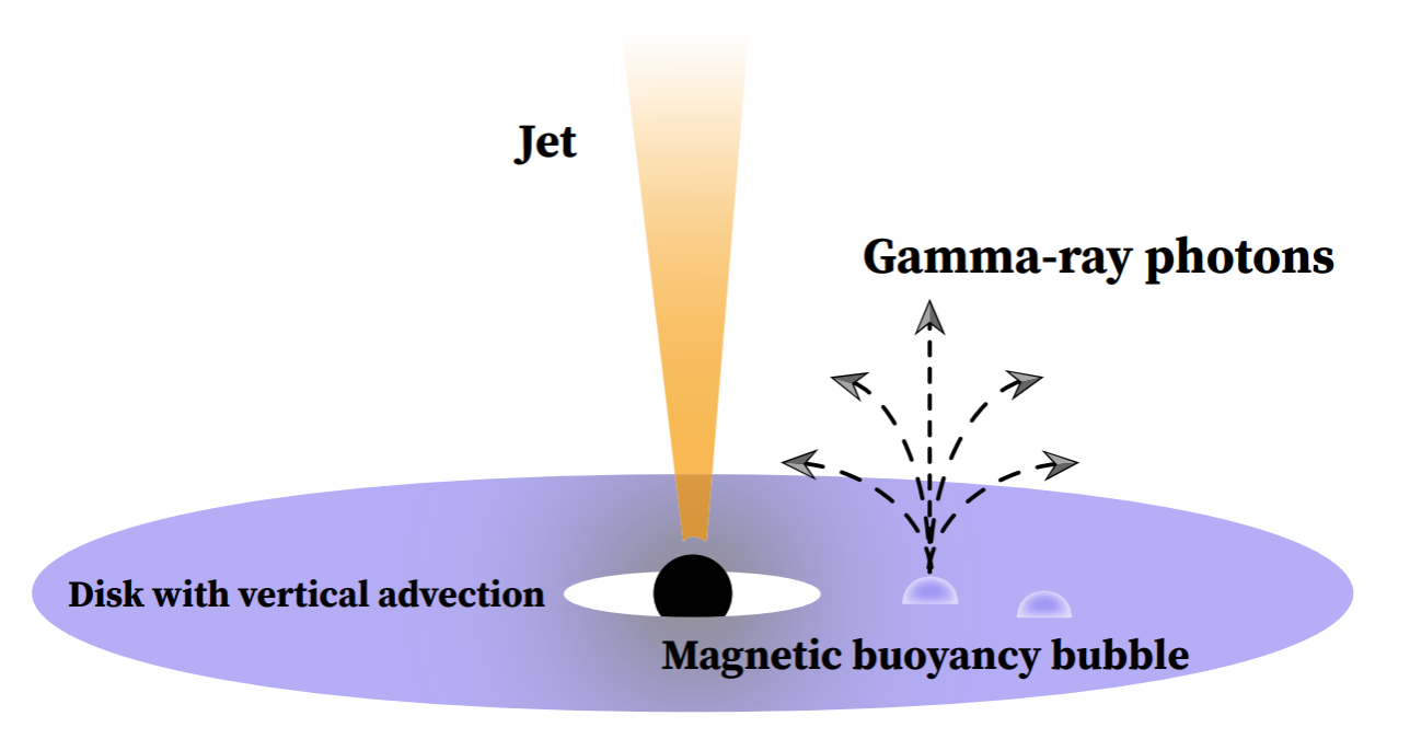 我们研究了具有垂向能移结构NDAF(如图1所示)的各向异性多信使辐射,包括千新星、MeV中微子和引力波。如果抛射物随角度分布呈现各向异性,那么可能导致千新星辐射各向异性;同时,因为垂向能移机制的存在,大量伽玛光子能够从盘中磁浮力驱动的气泡到达盘表面时逸出,而其发射方向很大程度上受到了中心快速旋转黑洞引力场的影响,这些光子一旦注入抛出物(如图2所示),必将增强千新星亮度和各向异性,特别是在早期光变中。此外,NDAF中的垂向能移机制会降低原本的中微子产量,而且气泡携带的中微子贡献非常有限,所以总的来说,对中微子能谱影响不大;那么,各向异性中微子辐射引发的引力波强度亦与无垂向能移机制的NDAF模型差异无几。