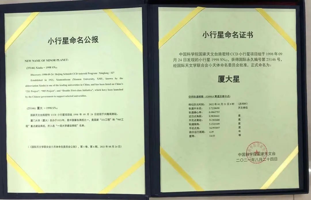 庆典同时也举办了“厦大星命名仪式”。厦大百年校庆之际,中国科学院国家天文台将施密特CCD小行星项目组的发现:编号为25146(临时编号:1998SN43)的小行星命名为“厦大星”,作为百年贺礼赠予厦门大学。国家天文台薛随建首席研究员宣读了命名公报。