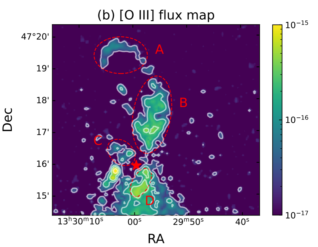 图1:10×10 合并且平滑过的[O III]λ5007流量图,叠加对应的等流量线。星系核心位于红星标记处。