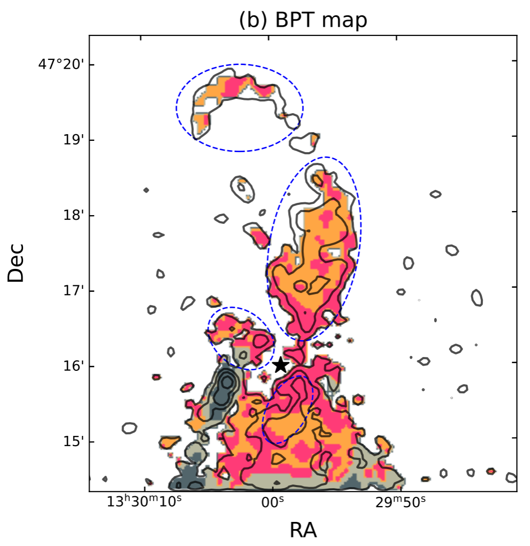 NGC 5195目前星系中心的AGN活动性非常低,而发射线诊断图(BPT)的结果显示该大尺度电离气体结构主要与AGN光致电离有关(图2),因此研究团队认为该结构应与过去的AGN活动有关:可能是来自于过去的AGN外流,也可能是被过去的AGN电离的潮汐剥离物质。无论是哪一种起源,都表明NGC 5195在过去存在剧烈的AGN活动。研究团队的结果显示NGC 5195是距离我们最近的存在大尺度延展电离气体结构的星系之一,未来可以作为研究过去AGN活动与星系相互作用等相关问题的理想目标。