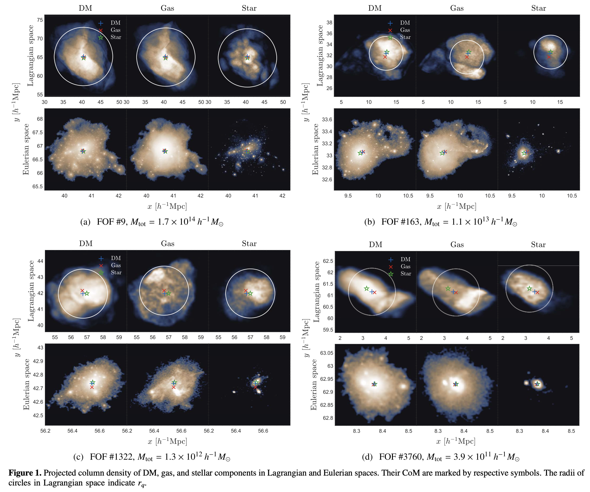 通过当前最先进的流体动力学星系演化模拟IllustrisTNG,我们量化了低红移时期的重子物质是如何示踪星系的原始自旋模式。下图(文章中Figure 1.)中显示了我们随机从4000多个星系样本中选取的4个位于不同质量区间内的星系暗物质、气体与恒星组分,分别在低红移宇宙欧拉(Eulerian)空间与高红移早期宇宙拉格朗日(Lagrangian)空间中柱密度投影示意图。