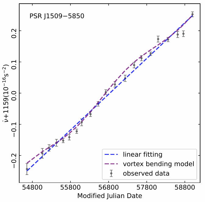 图2. PSR J1509−5850自转减慢率 随时间的演化,蓝色和紫色虚线分别为线性和涡旋弯曲模型的拟合。