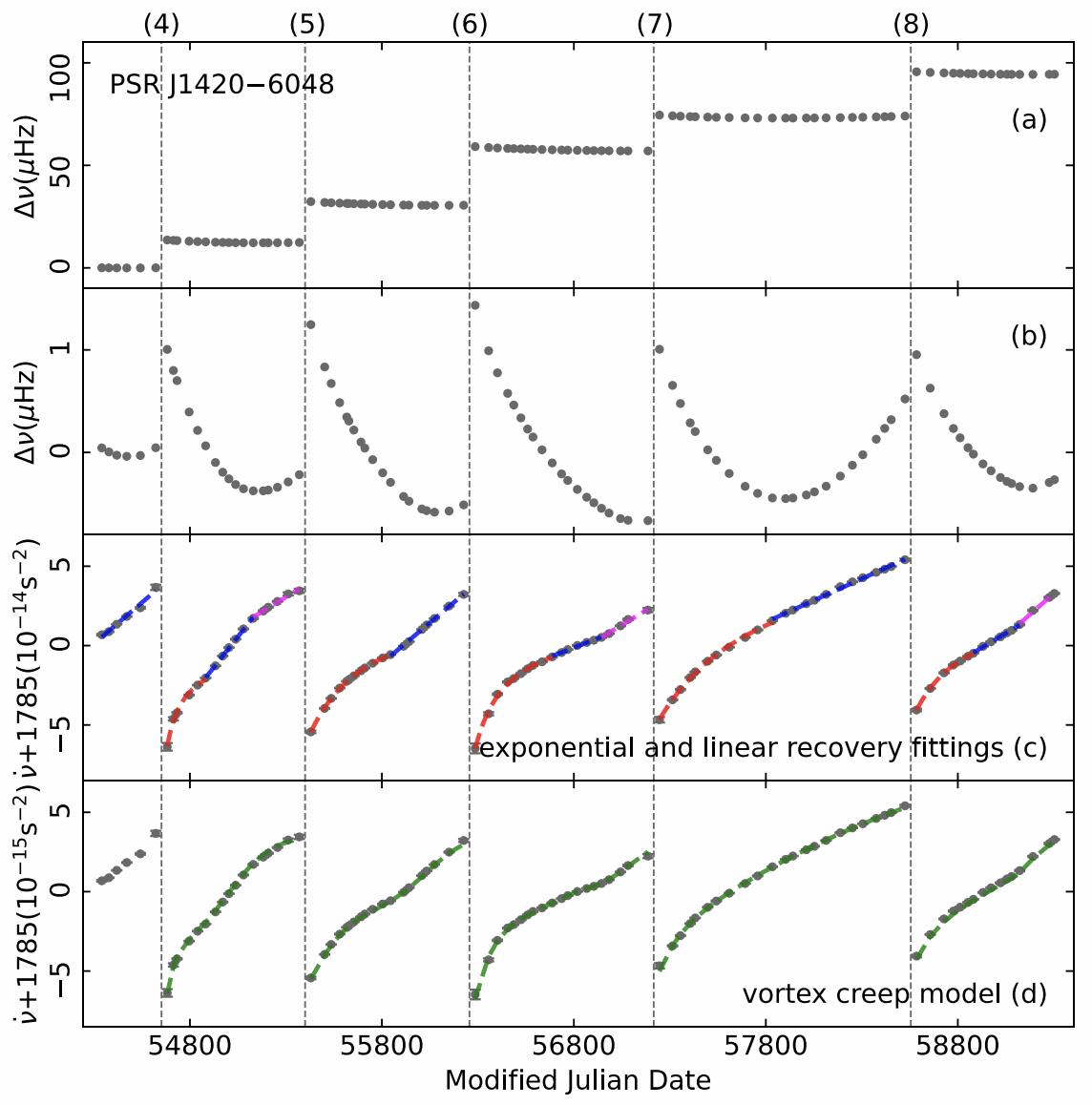 图1. PSR J1420−6048在周期跃变前后的自转参数的演化图像,中竖直的虚线为跃变发生时刻,顶部括号的数字为跃变的序号。