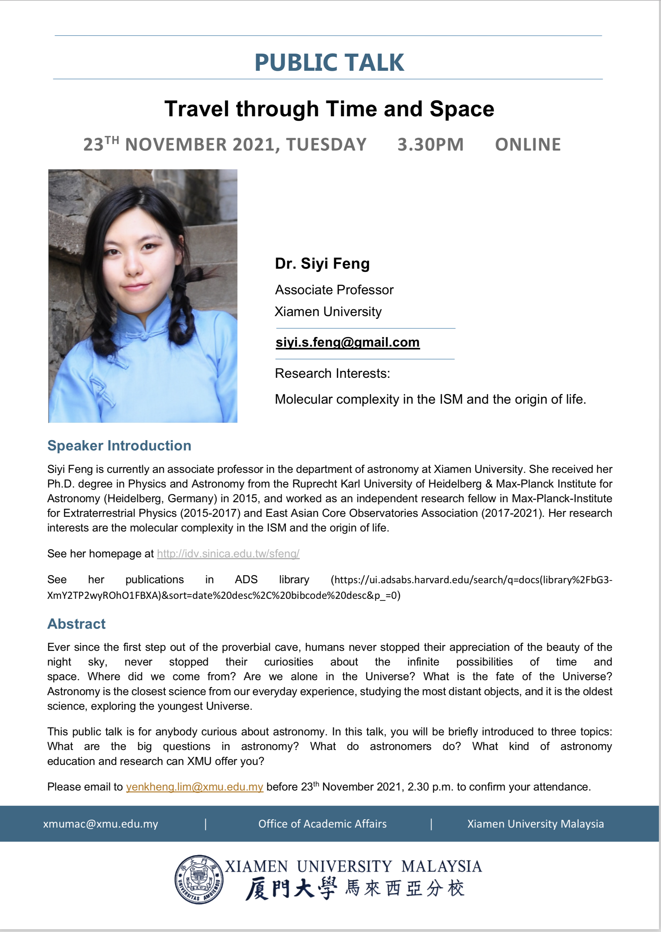 Siyi Feng is currently an associate professor in the department of astronomy at Xiamen University. She received her Ph.D. degree in Physics and Astronomy from the Ruprecht Karl University of Heidelberg & Max-Planck Institute for Astronomy (Heidelberg, Germany) in 2015, and worked as an independent research fellow in Max-Planck-Institute for Extraterrestrial Physics (2015-2017) and East Asian Core Observatories Association (2017-2021). Her research interests are the molecular complexity in the ISM and the origin of life.