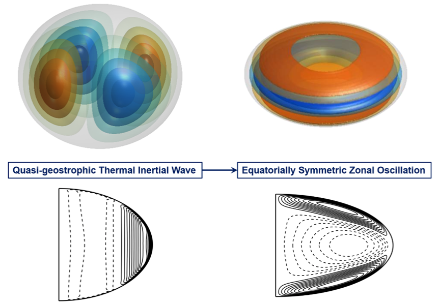 3. Li, W., and Kong, D.* (2023) Rapidly rotating self-gravitating Boussinesq fluid. III. A previously unknown zonal oscillation at the onset of rotating convection, Physical Review Fluids (Letter), 8, L011501