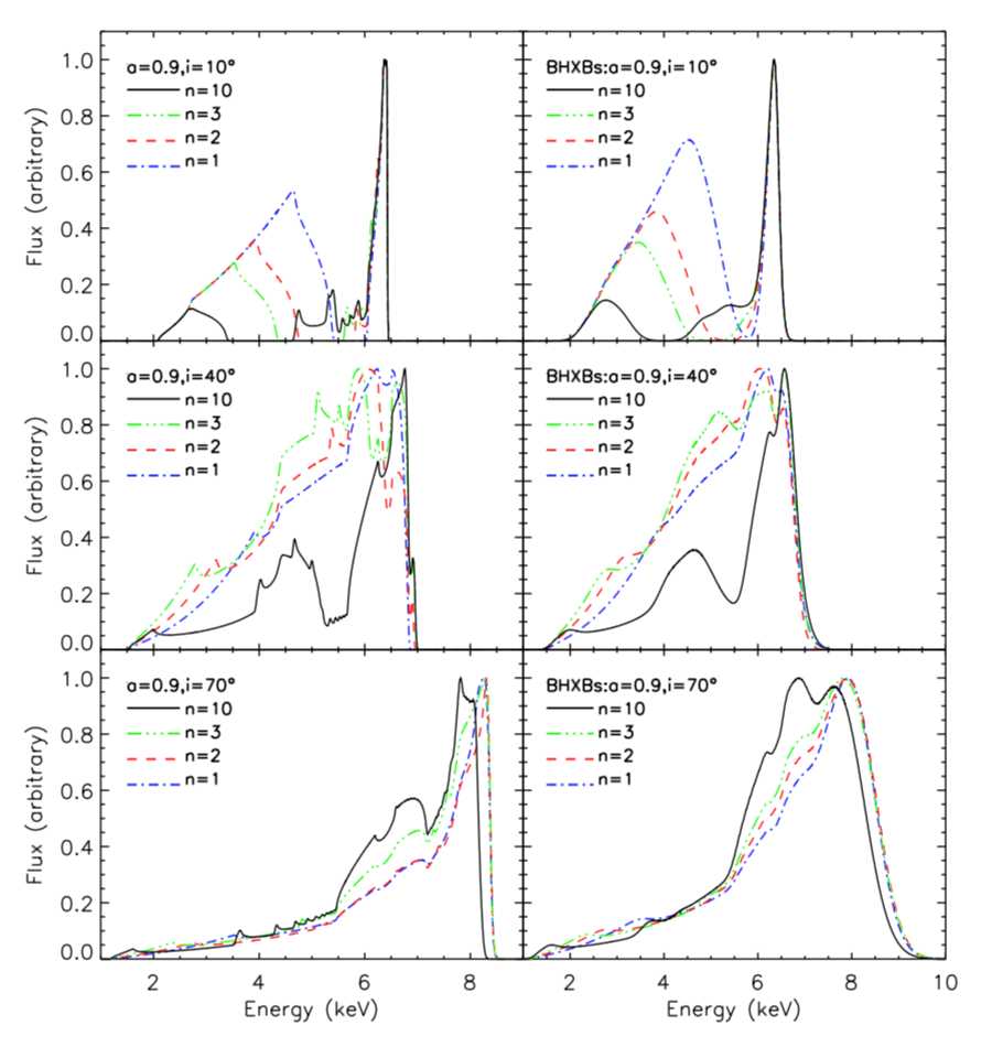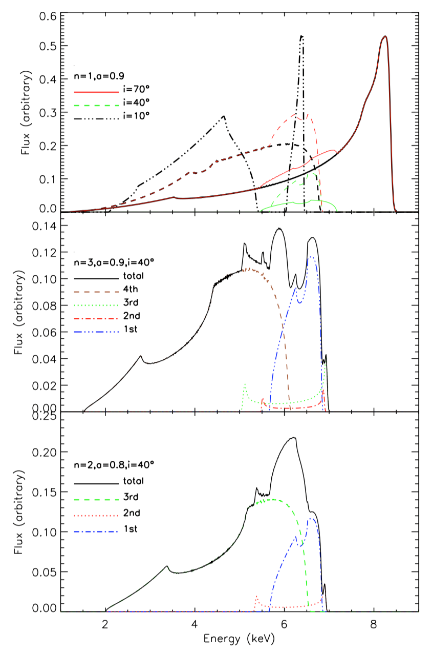 Abstract: The clumpy disc, or inhomogeneous accretion flow, has been proposed to explain the properties of accreting black hole systems. However, the observational evidences remain to be explored. In this work, we calculate the profiles of Fe K{\alpha} lines emitted from the inhomogeneous accretion flow through the ray-tracing technique, in order to find possible observable signals of the clumps. Compared with the skewed double peaked profile of the continuous standard accretion disc, the lines show a multi-peak structure when the emissivity index is not very steep. The peaks and wings are affected by the position and size of the cold clumps. When the clump is small and is located in the innermost region, due to the significant gravitational redshift, the blue wing can overlap with the red wing of the outer cold disc/clump, forming a fake peak or greatly enhancing the red peak. Given high enough resolution, it is easier to constrain the clumps around the supermassive black holes than the clumps in stellar mass black holes due to the thermal Doppler effect.