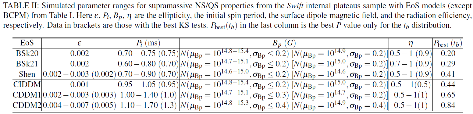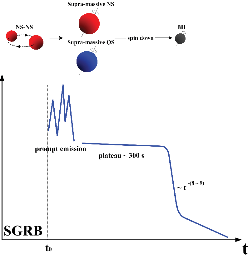 Recently, a team of astronomers from Xiamen University, led by associate Professor Ang Li, study four recently constructed “unified” NS EoSs (BCPM, BSk20, BSk21, and Shen) as well as three developed strange quark star (QS) EoSs within the new confinement density-dependent mass (CDDM) model, labelled as CIDDM, CDDM1, and CDDM2. All the EoSs chosen here satisfy the recent observational constraints of the two massive pulsars of which the masses are precisely measured. They construct sequences of rigidly rotating NS/QS configurations with increasing spinning frequency f, from nonrotating (f=0) to the Keplerian frequency (f=fK), and provide convenient analytical parametrizations of the results. Assuming that the cosmological NS-NS merger systems have the same mass distribution as the Galactic NS-NS systems, they demonstrate that all except the BCPM NS EoS can reproduce the current 22% supramassive NS/QS fraction constraint as derived from the SGRB data. They simultaneously simulate the observed quantities (the break time tb, the break time luminosity Lb, and the total energy in the electromagnetic channel Etotal) of SGRBs and find that, while equally well reproducing other observational constraints, QS EoSs predict a much narrower tb distribution than that of the NS EoSs, better matching the data. They therefore suggest that the postmerger product of NS-NS mergers might be fast-rotating supramassive QSs rather than NSs.