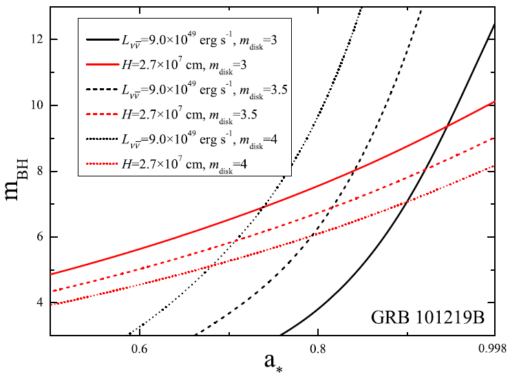 Black holes (BHs) hide themselves behind various astronomical phenomena and their properties, i.e., mass and spin, are usually difficult to constrain. One leading candidate for the central engine model of gamma-ray bursts (GRBs) invokes a stellar mass BH and a neutrino-dominated accretion flow (NDAF), with the relativistic jet launched due to neutrino-anti-neutrino annihilations. Such a model gives rise to a matter-dominated fireball, and is suitable to interpret GRBs with a dominant thermal component with a photospheric origin. A team of astronomers from Xiamen University, led by associate Professor Tong Liu propose a method to constrain BH mass and spin within the framework of this model and apply the method to the thermally dominant GRB 101219B, whose initial jet launching radius, r0, is constrained from the data. Using our numerical model of NDAF jets, we estimate the following constraints on the central BH: mass MBH~5–9M⊙, spin parameter a*~0.6, and disk mass 3M⊙ <Mdisk<4M⊙. Our results also suggest that the NDAF model is a competitive candidate for the central engine of GRBs with a strong thermal component.